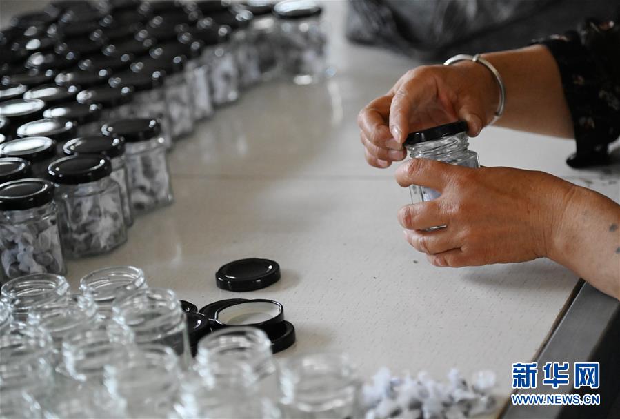 在平頂山市葉縣常村鎮(zhèn)月臺(tái)村扶貧車間,村民在趕制用艾草做成的臍貼(5月27日攝)。新華社記者張浩然攝