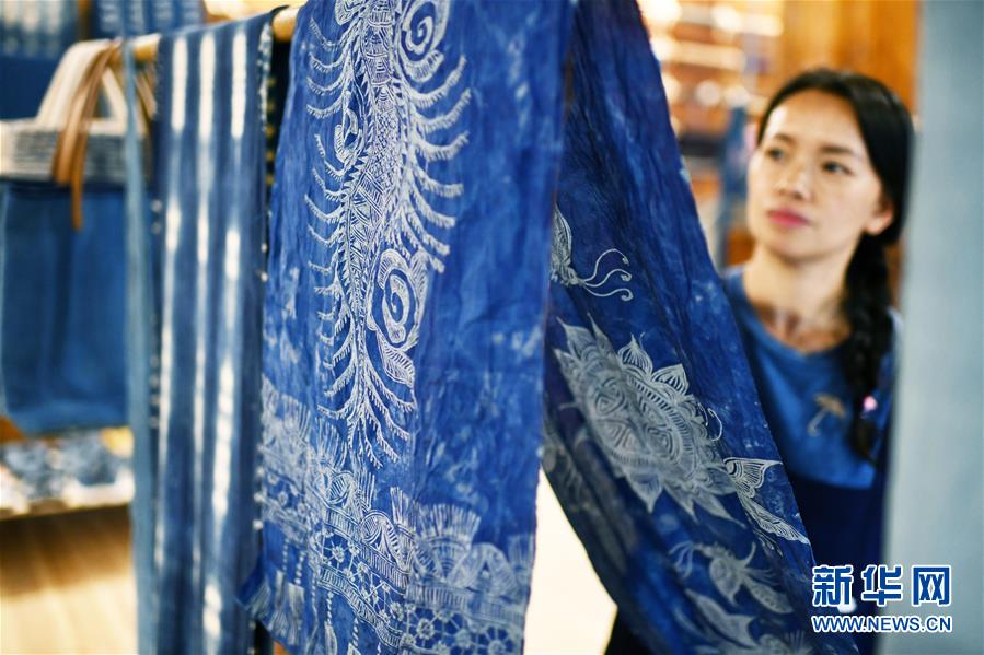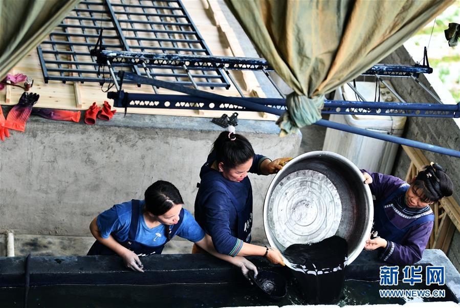 2018年,楊成蘭在村里成立傳統(tǒng)織染合作社,吸引村里及周邊村寨貧困戶入股,帶動當?shù)刎毨艉痛迕窦尤牒献魃纾瑥氖驴棽?、染布、藍靛種植等產(chǎn)業(yè),在傳承民族傳統(tǒng)手工技藝的同時,幫助村民脫貧增收。新華社記者楊文斌攝