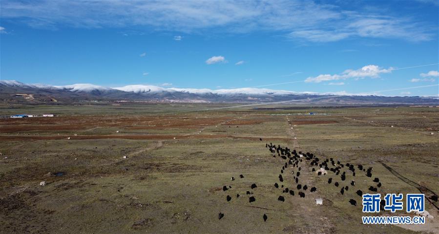 這是5月29日在四川省甘孜藏族自治州理塘縣奔戈鄉(xiāng)卡灰村拍攝的集體農(nóng)場(無人機照片)。四川省甘孜藏族自治州理塘縣地處青藏高原東部,縣城海拔約4000米,有“天空之城”的美譽。時值初夏,理塘的天空碧藍如洗,巍峨的雪山環(huán)繞四周,牦牛星星點點散落于曠野之上,構(gòu)成一幅高原特有的壯美圖景。新華社記者李夢馨攝