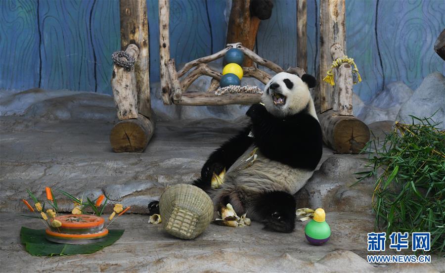 6月1日,大熊貓“貢貢”在進(jìn)食。新華社記者楊冠宇攝