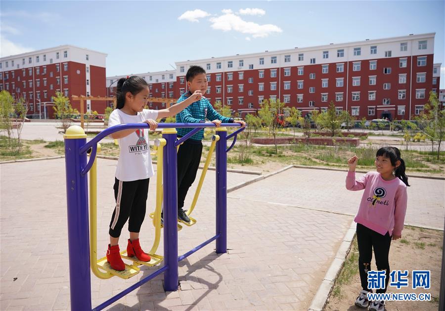 6月2日,兒童在尚義縣大青溝鎮(zhèn)的易地扶貧搬遷集中安置小區(qū)的廣場(chǎng)玩耍。新華社記者楊世堯攝。