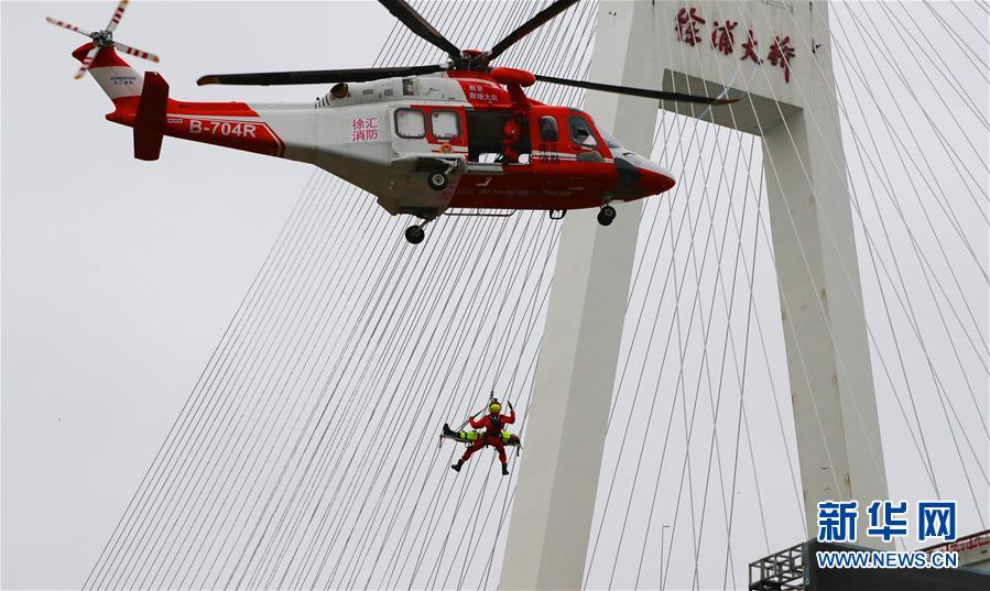 6月3日,航空救援直升機(jī)在演練中救起“傷員”。新華社記者方喆攝。