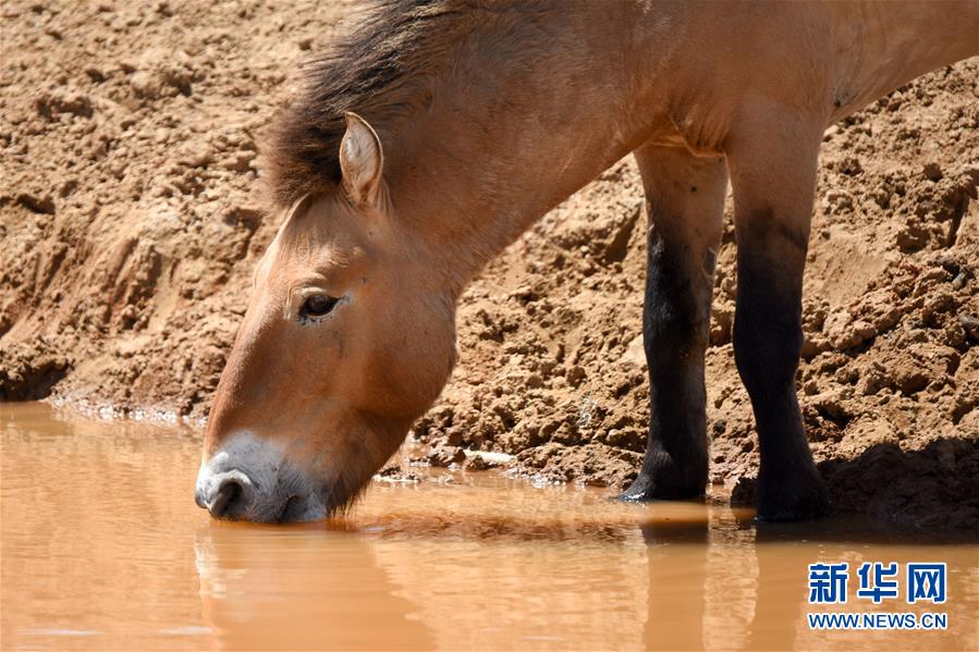 在新疆卡拉麥里山有蹄類野生動物自然保護(hù)區(qū),一匹普氏野馬在水源地飲水(6月3日攝)。新華社記者丁磊攝。