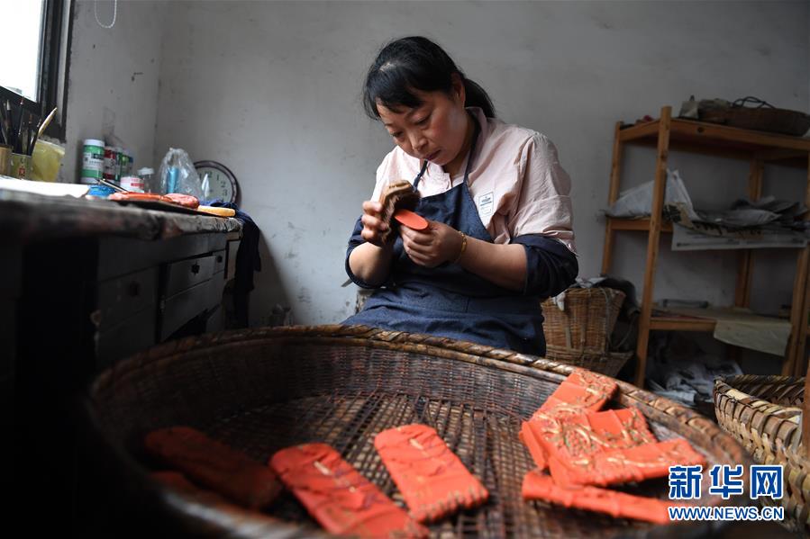 5月20日,安徽歙縣“項(xiàng)氏徽墨”的工人為墨打蠟。新華社記者劉軍喜攝。