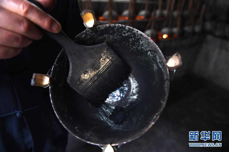 5月21日,安徽省非物質文化遺產徽墨代表性傳承人項德勝收集集煙碗中的桐油煙灰。新華社記者張端攝。