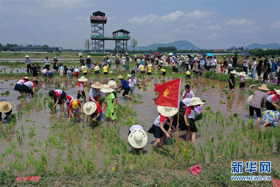 6月7日,孩子和家長(zhǎng)在稻田里插秧。新華社記者徐昱攝