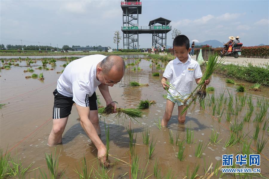 6月7日,孩子和家長(zhǎng)體驗(yàn)稻田插秧。新華社記者徐昱攝