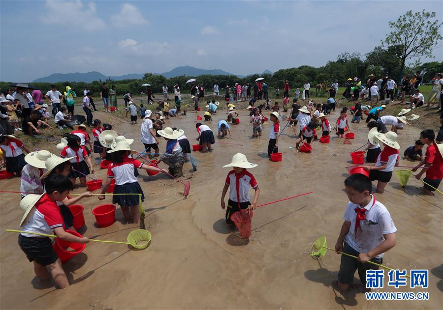 6月7日,孩子和家長(zhǎng)們參加渾水摸魚(yú)趣味活動(dòng)。新華社記者徐昱攝