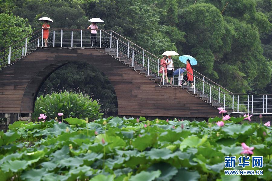 6月7日,一陣小雨過(guò)后,福州金山公園內(nèi)盛開的荷花愈加?jì)善G欲滴,吸引市民前來(lái)游覽。新華社記者姜克紅攝