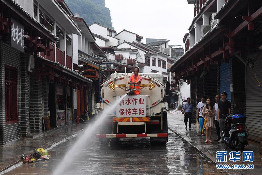6月8日,在廣西陽朔縣西街,環(huán)衛(wèi)工人在沖洗被洪水浸泡的街道。6月6日至8日,廣西陽朔縣普降暴雨,局部降特大暴雨,全縣9個鄉(xiāng)鎮(zhèn)出現(xiàn)洪澇災(zāi)害。目前,全縣正有序開展災(zāi)后生產(chǎn)生活恢復(fù)。新華社記者陸波岸攝