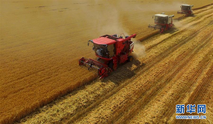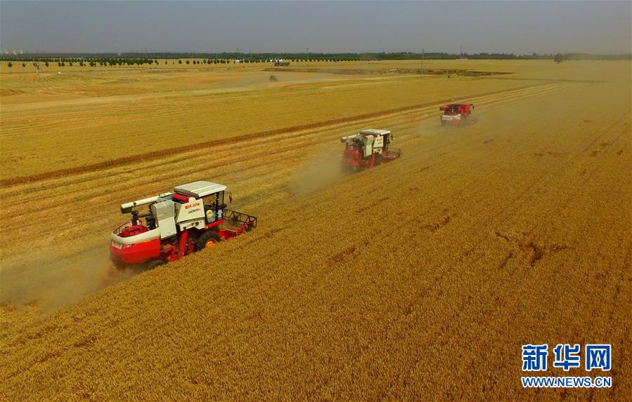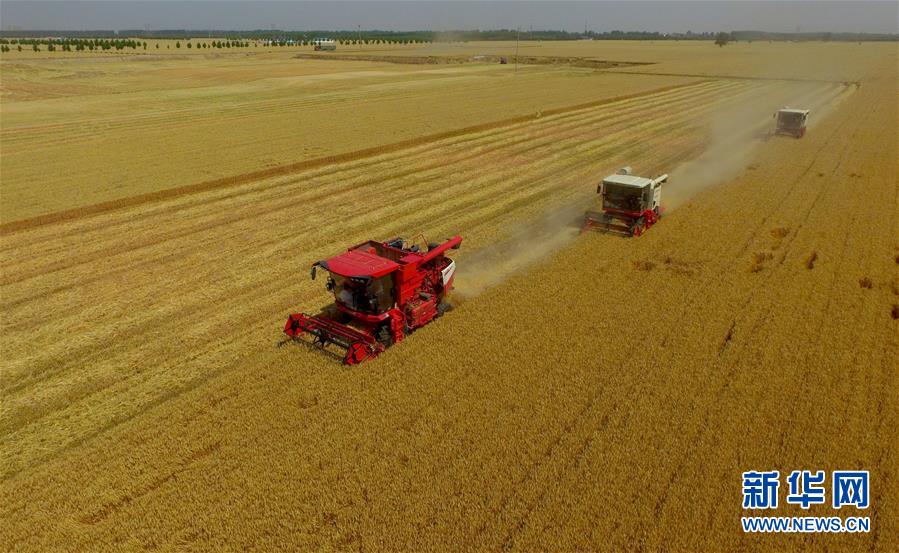 6月8日,聯(lián)合收割機(jī)在河北省南和縣閆里鄉(xiāng)閆里村麥田進(jìn)行夏收作業(yè)(無人機(jī)照片)。“三夏”期間,河北省預(yù)計(jì)組織和調(diào)度小麥聯(lián)合收割機(jī)、拖拉機(jī)、夏玉米播種機(jī)等200萬臺農(nóng)業(yè)機(jī)械投入作業(yè)。新華社記者朱旭東攝
