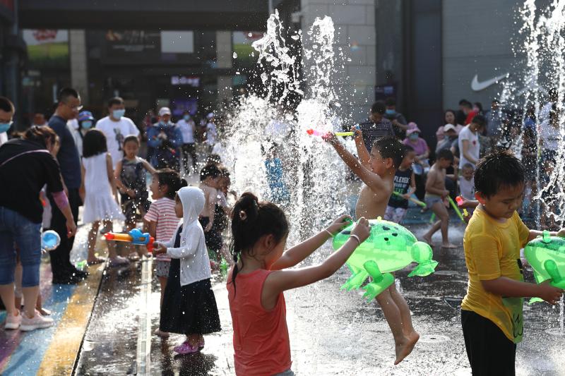 2020年6月7日,北京,華西熙LIVE的噴泉水池成為孩童的戲水降暑天堂。北京6日下午發(fā)高溫藍色預(yù)警,預(yù)計6月7日至8日,北京大部分地區(qū)日最高氣溫達36℃以上。