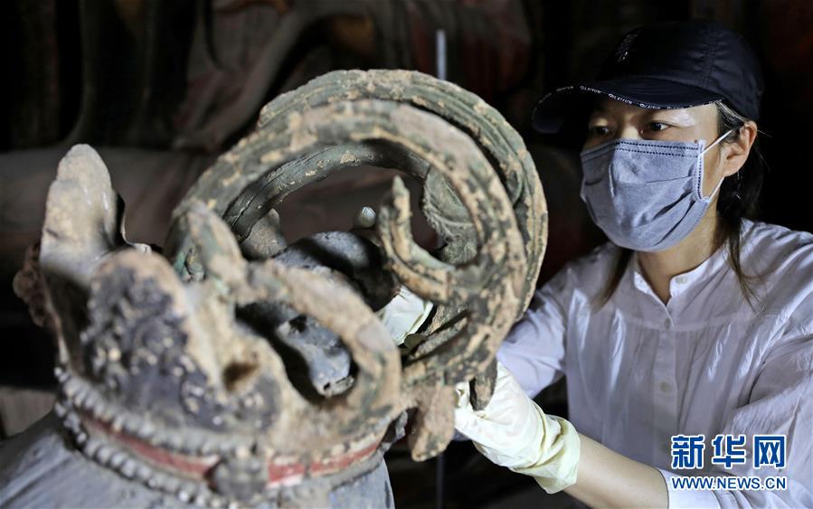 6月8日,工作人員對奉國寺的彩繪泥塑進(jìn)行保護(hù)修復(fù)。新華社記者姚劍鋒攝