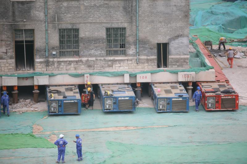 2020年6月9日,濟(jì)南在歷山路與東關(guān)大街交叉口,液壓模塊拖車(chē)在修女樓底部做好平移準(zhǔn)備。