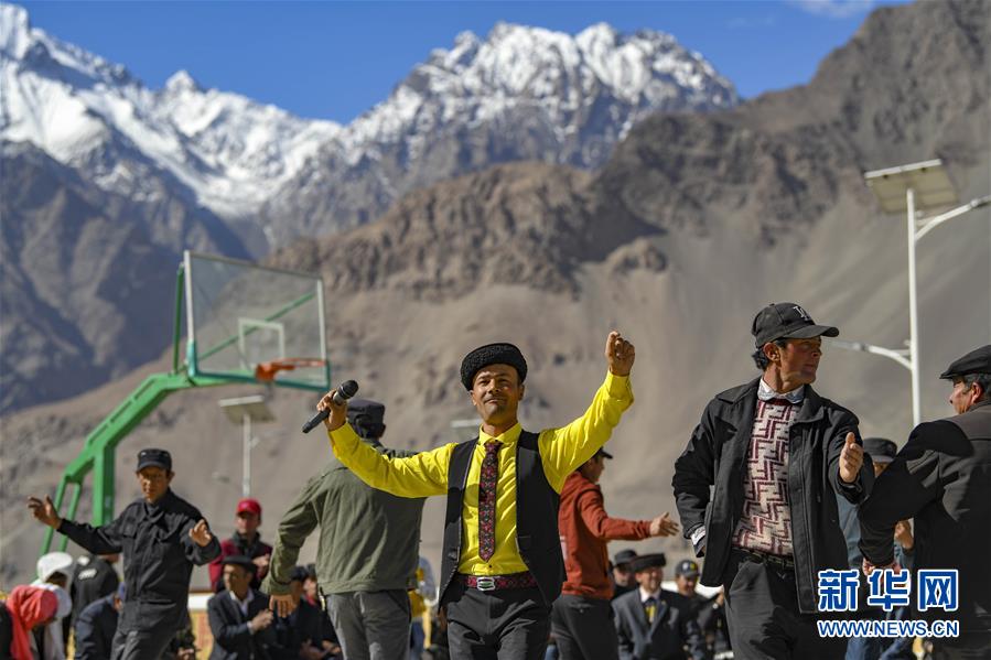 在熱斯喀木村,新疆塔什庫(kù)爾干塔吉克自治縣文工團(tuán)演員阿布都熱蘇力·曼蘇爾汗(身著黃色襯衣者)為村民演唱民歌《我愛(ài)你,祖國(guó)》(6月6日攝)。新華社記者胡虎虎攝