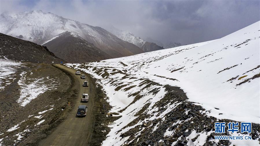 新疆塔什庫(kù)爾干塔吉克自治縣文工團(tuán)演員開(kāi)車翻越雪山達(dá)坂,前往達(dá)布達(dá)爾鄉(xiāng)熱斯喀木村演出(6月5日攝,無(wú)人機(jī)照片)。新華社記者胡虎虎攝