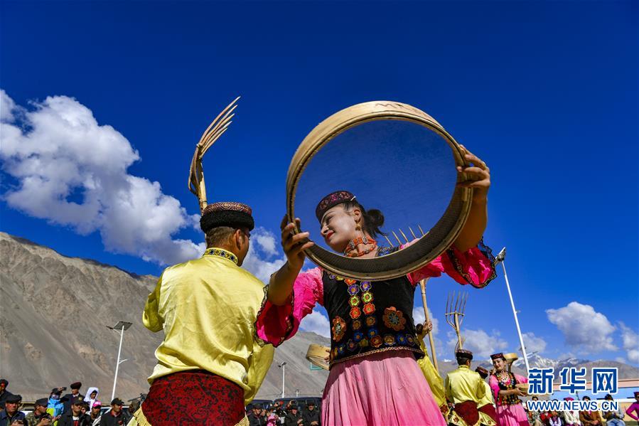 在熱斯喀木村,新疆塔什庫(kù)爾干塔吉克自治縣文工團(tuán)演員(左)與村民一起跳舞(6月6日攝)。新華社記者胡虎虎攝