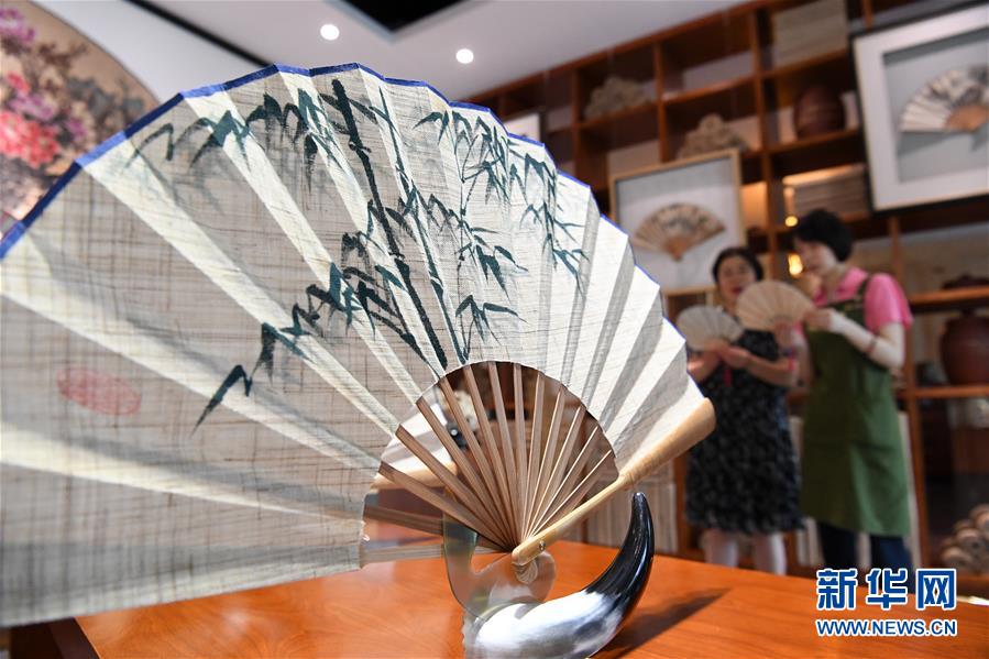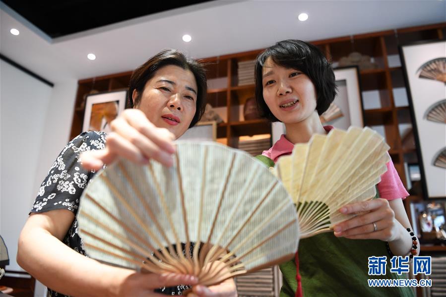 6月12日,非遺傳承人馬仁芬(左)與馬琳沁在探討夏布折扇的創(chuàng)新設(shè)計(jì)。新華社記者 唐奕 攝