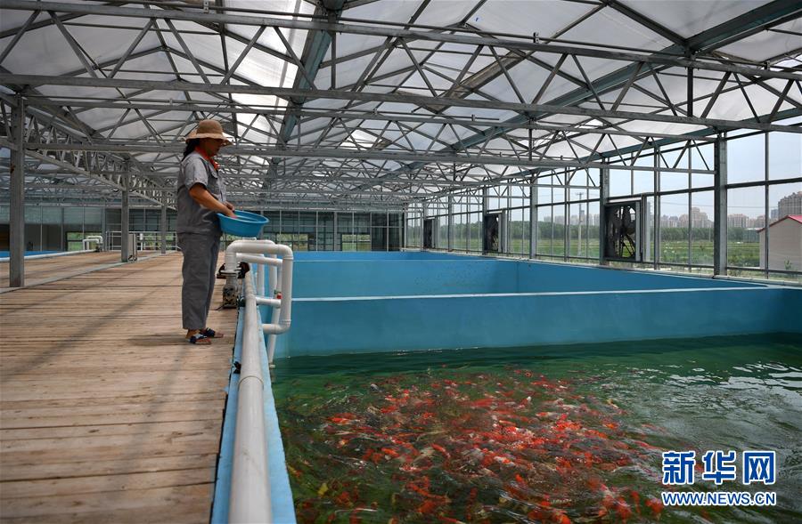 在天津現(xiàn)代晨輝科技集團(tuán)有限公司的養(yǎng)殖示范場(chǎng),工人在投喂飼料(6月15日攝)。近年來(lái),天津市寶坻區(qū)大白莊鎮(zhèn)大力發(fā)展觀賞魚(yú)養(yǎng)殖,在當(dāng)?shù)佚堫^企業(yè)的帶動(dòng)下,成為增加農(nóng)民收入的新途徑。據(jù)了解,企業(yè)對(duì)附近養(yǎng)殖戶統(tǒng)一提供苗種、飼料、技術(shù)支持,以及觀賞魚(yú)成魚(yú)后保價(jià)回收的服務(wù)。養(yǎng)殖戶每畝水面平均收入約1.8萬(wàn)元,解決周邊農(nóng)民就業(yè)近200人。新華社記者 李然 攝