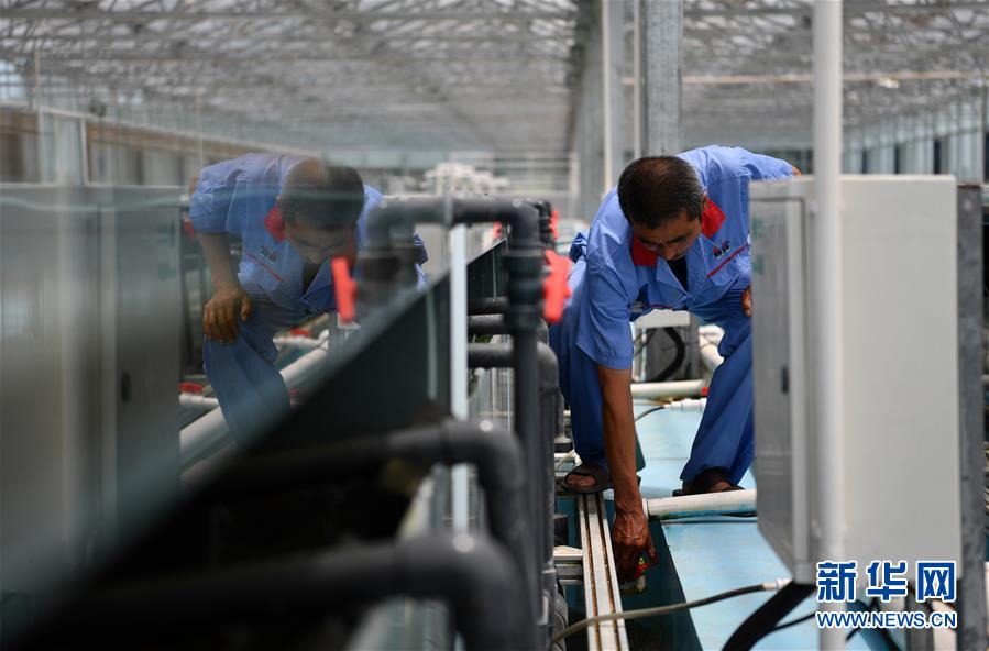 在天津現代晨輝科技集團有限公司的養(yǎng)殖示范場,工人在調試設備(6月15日攝)。新華社記者 李然 攝
