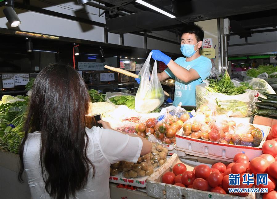 6月17日,在位于北京市海淀區(qū)的增光鴻運(yùn)市場(chǎng),市民(左)在購(gòu)買蔬菜。新華社記者 任超 攝