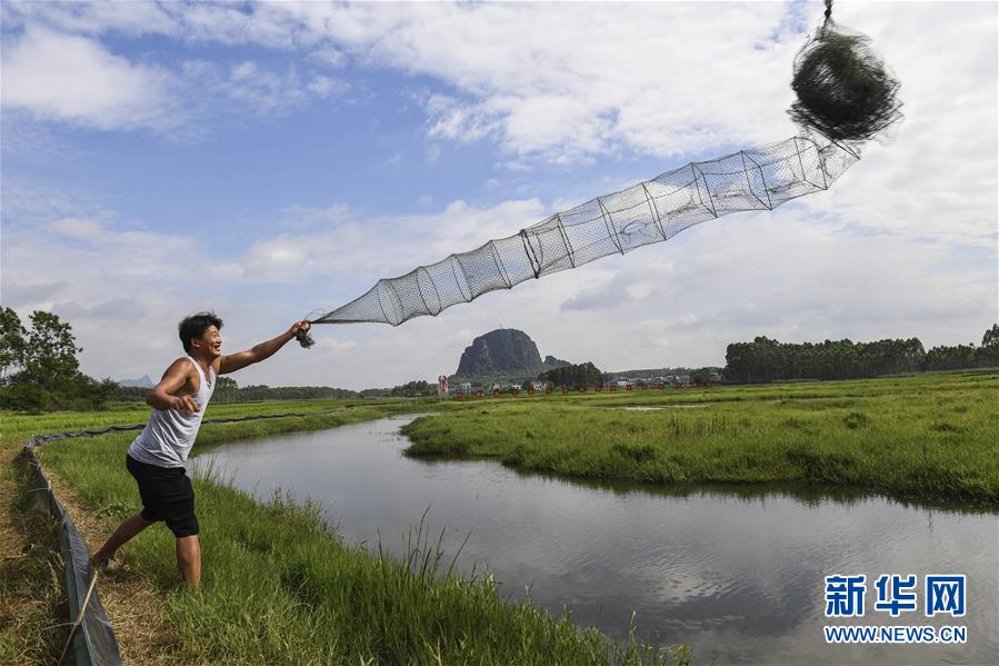 6月17日,在廣西武宣縣祿新鎮(zhèn)上堂村稻蝦輪作養(yǎng)殖示范基地,村民將捕蝦籠拋入蝦塘中。新華社記者 曹祎銘 攝