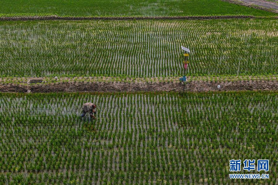 6月17日,農(nóng)民在盤錦市盤山縣太平街道張家村稻田間進行管護作業(yè)(無人機照片)。新華社記者 潘昱龍 攝