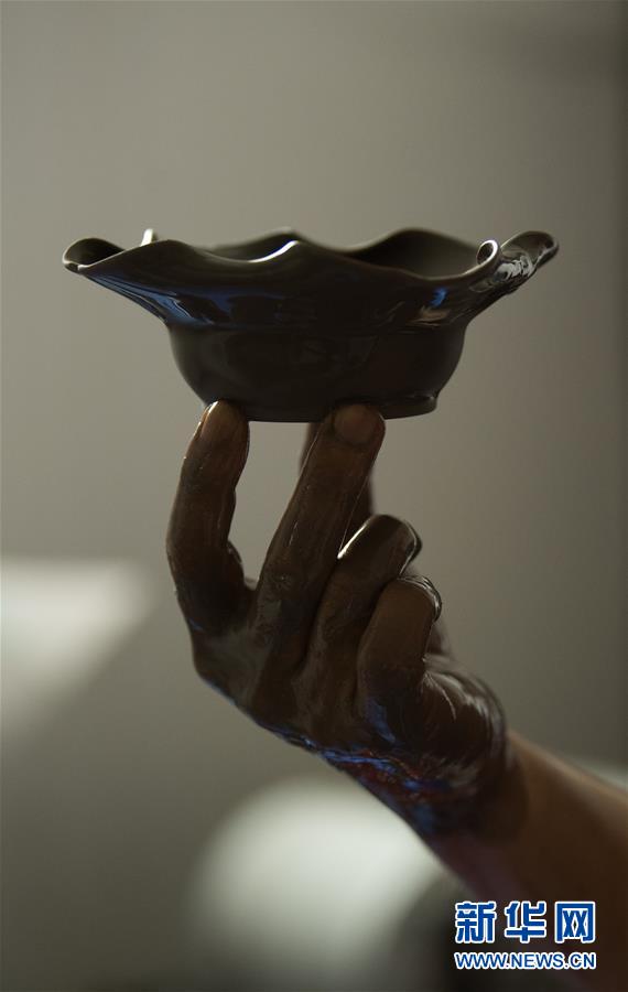 6月17日,在位于浙江慈溪的工作室,聞長慶查看一件剛浸釉完畢的盞托。新華社記者 翁忻旸 攝