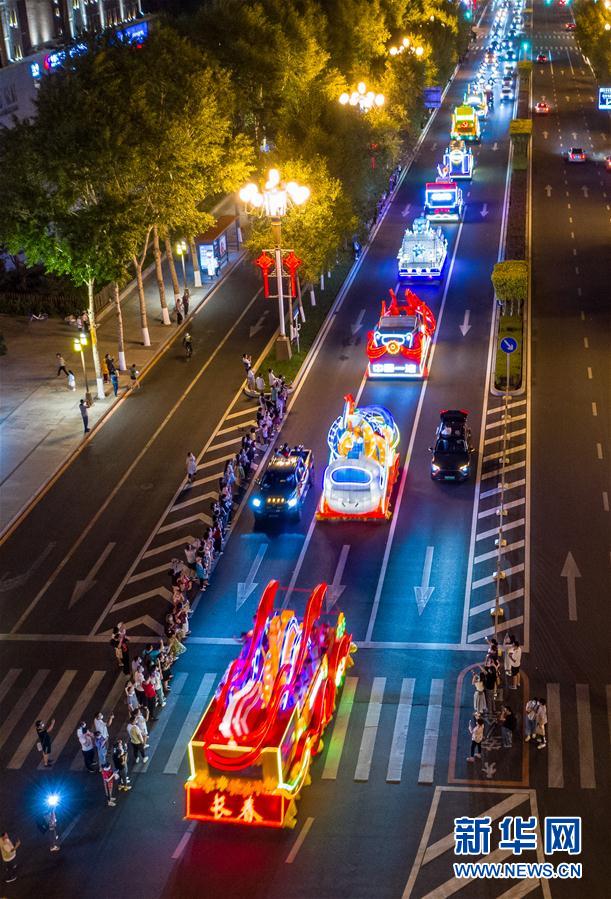 6月19日,花車在長(zhǎng)春市人民大街上巡游(無人機(jī)照片)。新華社記者張楠攝