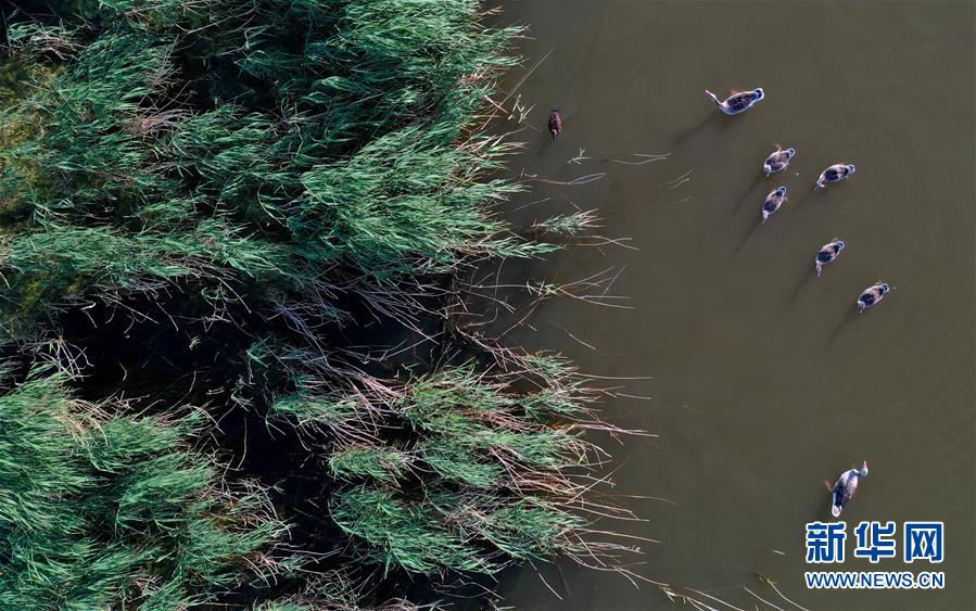 6月19日,一群鴨子在新疆烏倫古湖國(guó)家濕地公園覓食(無(wú)人機(jī)照片)。烏倫古湖國(guó)家濕地公園位于新疆阿勒泰地區(qū)福海縣城以西,由烏倫古湖和吉力湖兩部分組成。烏倫古湖濕地公園是遷徙候鳥(niǎo)飛越天山和阿爾泰山的“能量補(bǔ)充站”,良好的濕地生態(tài)吸引著大量遷徙鳥(niǎo)類(lèi)在此集結(jié)成群,繁殖棲息,成為一道靚麗的風(fēng)景線。新華社記者 沙達(dá)提 攝