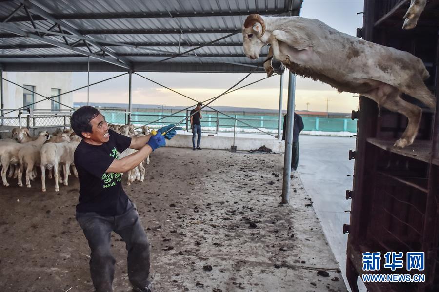 6月12日,在內(nèi)蒙古烏蘭察布東來順肉類加工廠內(nèi),工人將貨車上的綿羊引下車。近年來,京蒙對口幫扶的力度不斷加大。越來越多的北京企業(yè)來到烏蘭察布,通過多種方式幫助當(dāng)?shù)刎毨У貐^(qū)的農(nóng)牧民擺脫貧困、走上致富路。新華社記者彭子洋攝