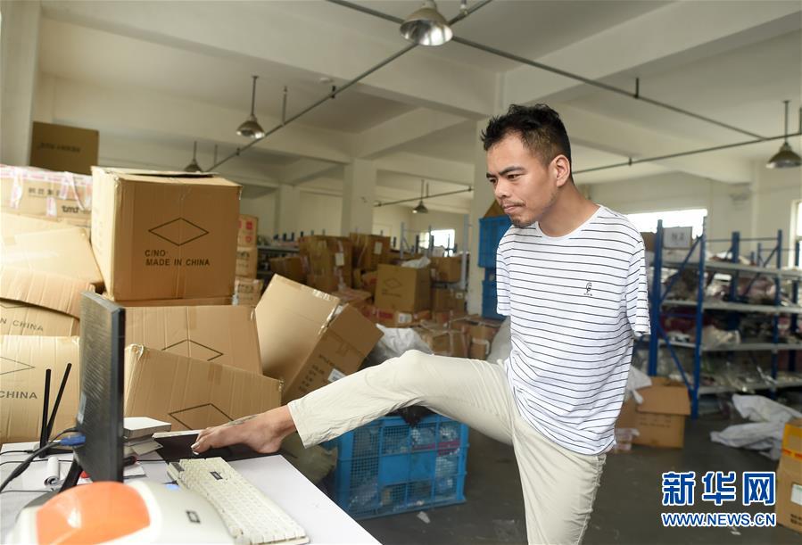 6月12日,金江偉用腳控制鼠標(biāo)打印網(wǎng)店訂單。今年34歲的金江偉是浙江省諸暨市楓橋鎮(zhèn)樂山村村民。5歲時的一場意外讓他失去了雙臂,但金江偉沒有向命運屈服。從2016年起,金江偉和弟弟開始在電商領(lǐng)域創(chuàng)業(yè),開網(wǎng)店銷售襪子,金江偉負(fù)責(zé)網(wǎng)店策劃和客服。經(jīng)過苦練,他用腳打字的速度已經(jīng)與常人無異。在他的努力下,這幾年網(wǎng)店年銷售額超過100萬元。新華社記者韓傳號攝