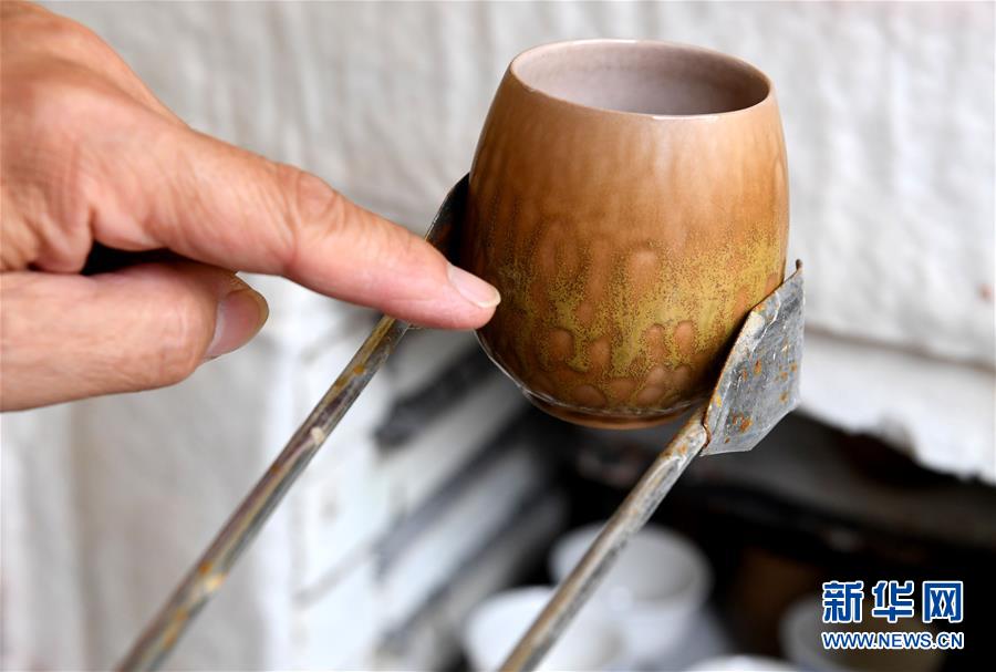 在河南省鞏義市站街鎮(zhèn)小黃冶村的工作室里,游光明在研究釉色的流動(dòng)性(6月19日攝)。新華社記者李安攝