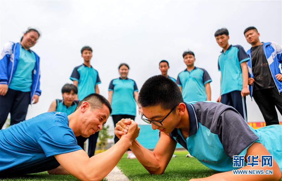 6月22日,河北省邯鄲市邯山區(qū)第一中學(xué)的高三學(xué)生和老師進(jìn)行“掰手腕”游戲。2020年高考臨近,河北省邯鄲市邯山區(qū)第一中學(xué)在積極做好高三學(xué)生復(fù)習(xí)備考的同時,開展多種形式的減壓活動,幫助學(xué)生釋放緊張情緒。新華社記者王曉攝