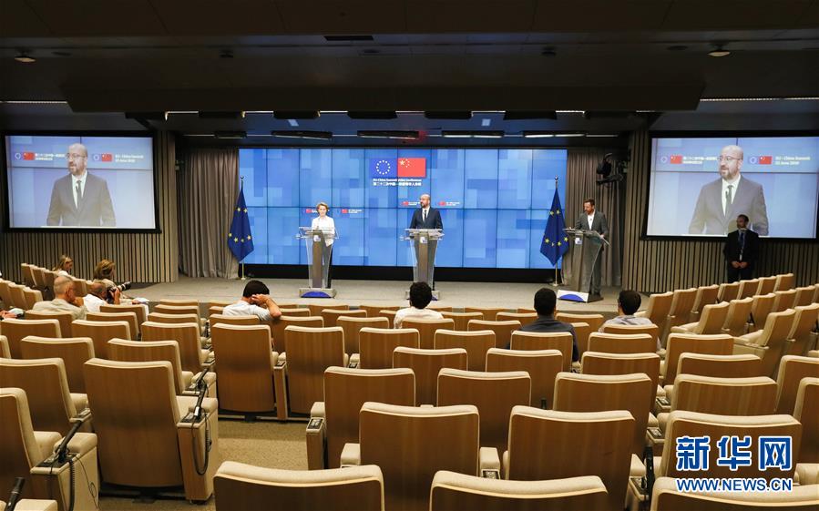 6月22日,歐洲理事會(huì)主席米歇爾(中右)和歐盟委員會(huì)主席馮德萊恩(中左)在位于比利時(shí)布魯塞爾的歐盟總部出席第二十二次中國(guó)-歐盟領(lǐng)導(dǎo)人會(huì)晤后舉行的新聞發(fā)布會(huì)。新華社記者鄭煥松攝
