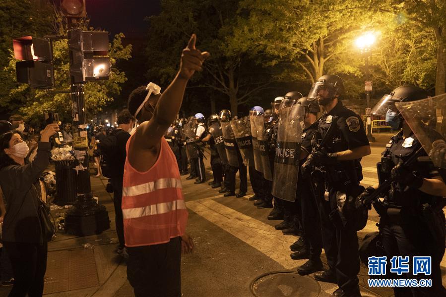 6月22日,警察和示威者在美國(guó)華盛頓白宮附近對(duì)峙。美國(guó)警察和示威者22日晚在首都華盛頓市白宮北側(cè)拉斐特廣場(chǎng)發(fā)生沖突并對(duì)峙。美國(guó)總統(tǒng)特朗普在社交媒體上說,許多人因破壞廣場(chǎng)上美國(guó)前總統(tǒng)安德魯·杰克遜的雕像及附近圣約翰圣公會(huì)教堂被逮捕。新華社記者劉杰攝
