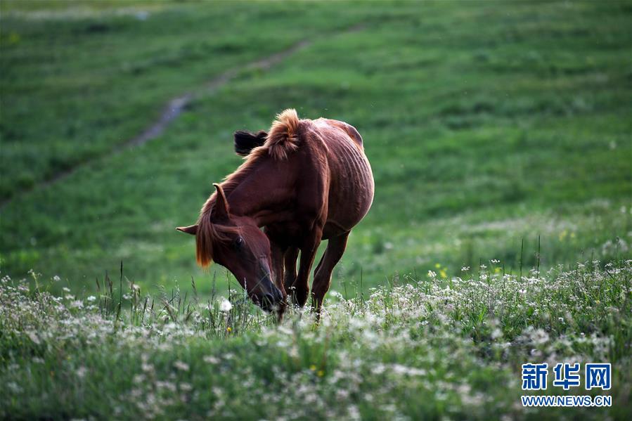 一匹馬在新疆喀納斯景區(qū)內(nèi)吃草(6月24日攝)。新華社記者 沙達(dá)提 攝