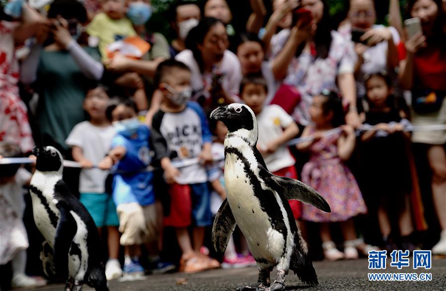 6月26日,上海動(dòng)物園的企鵝在游客面前漫步。新華社記者 張建松 攝