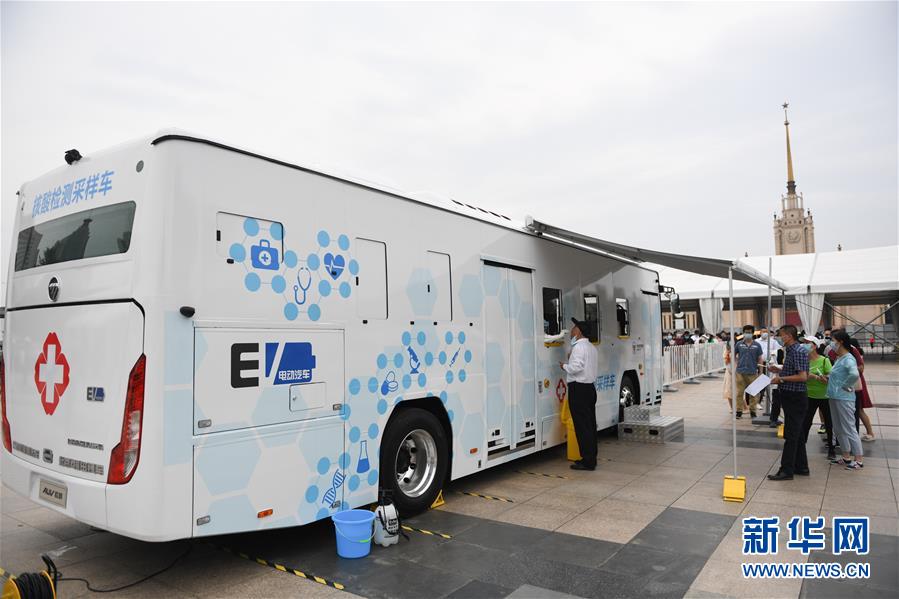 6月28日,在北京市西城區(qū)北京展覽館南側(cè)的露天廣場核酸檢測采樣點,前來做檢測的人員在核酸檢測采樣車旁進行采樣。新華社記者鞠煥宗攝