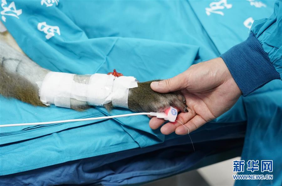 6月29日,研究人員在病房內(nèi)為移植肝受體猴按摩手部。日前,多基因編輯豬-恒河猴異種肝、心、腎器官移植在位于陜西西安的空軍軍醫(yī)大學(xué)西京醫(yī)院順利實施。研究團隊使用豬內(nèi)源性逆轉(zhuǎn)錄病毒(PERV)敲除的13個基因修飾豬作為供體,將一個供體豬的肝、心、腎分別移植給3只恒河猴受體。目前,移植肝和對應(yīng)的受體猴已存活16天,突破國際上的豬-猴輔助性肝移植最長存活時間記錄。這項研究有助于未來解決器官短缺造成的臨床器官移植發(fā)展受限難題。新華社記者邵瑞攝