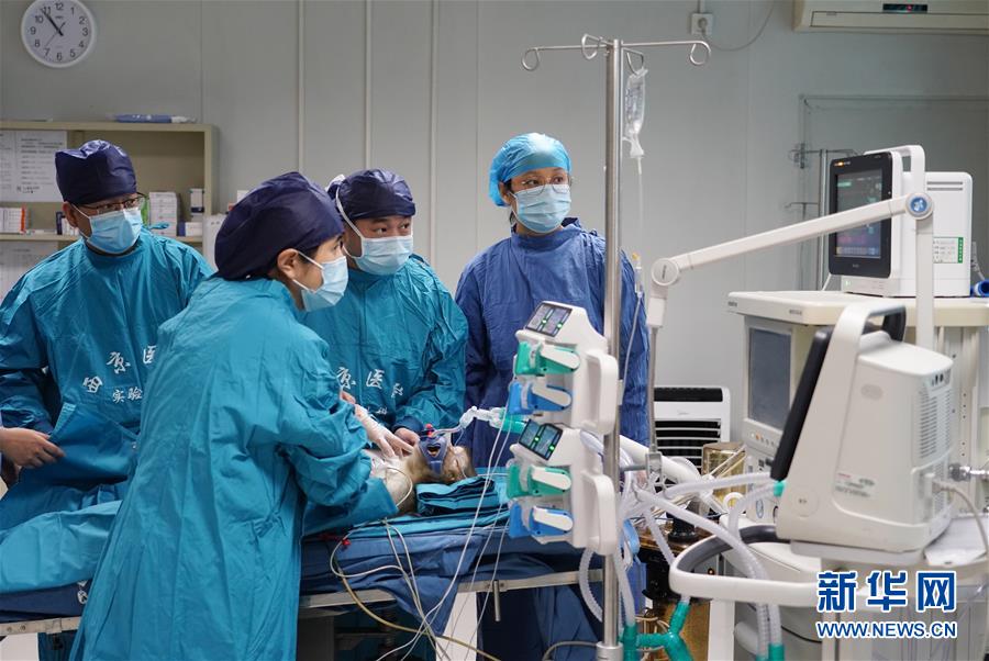 豬-猴異種肝心腎器官移植手術(shù)現(xiàn)場(6月13日攝)。日前,多基因編輯豬-恒河猴異種肝、心、腎器官移植在位于陜西西安的空軍軍醫(yī)大學(xué)西京醫(yī)院順利實施。研究團隊使用豬內(nèi)源性逆轉(zhuǎn)錄病毒(PERV)敲除的13個基因修飾豬作為供體,將一個供體豬的肝、心、腎分別移植給3只恒河猴受體。目前,移植肝和對應(yīng)的受體猴已存活16天,突破國際上的豬-猴輔助性肝移植最長存活時間記錄。這項研究有助于未來解決器官短缺造成的臨床器官移植發(fā)展受限難題。新華社發(fā)(張懿楠攝)