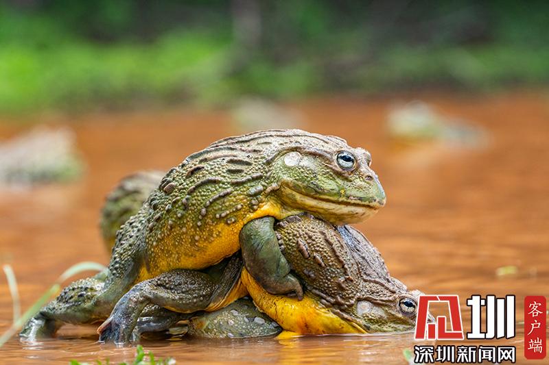 2020年6月30日?qǐng)?bào)道(具體拍攝時(shí)間不詳),南非波羅克瓦克,兩只雄性非洲牛蛙為了爭(zhēng)奪雌性牛蛙,在池塘中打架,這樣的情形十分罕見(jiàn)。畫(huà)面中,戰(zhàn)況十分激烈,一只非洲牛蛙在另外一只試圖逃到池塘邊緣時(shí)撕咬對(duì)手,甚至將另外一只拋向空中。這些精彩的照片是由南非開(kāi)普敦?cái)z影師Temujin Johnson拍攝的。