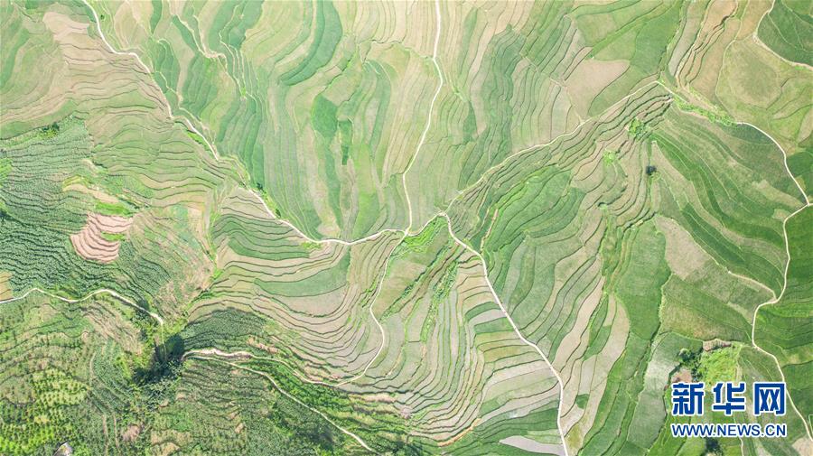 貴州省盤(pán)州市新民鎮(zhèn)的梯田風(fēng)光(6月29日攝,無(wú)人機(jī)照片)。夏日時(shí)節(jié),貴州省盤(pán)州市新民鎮(zhèn)的梯田風(fēng)景如畫(huà)。新華社記者陶亮攝