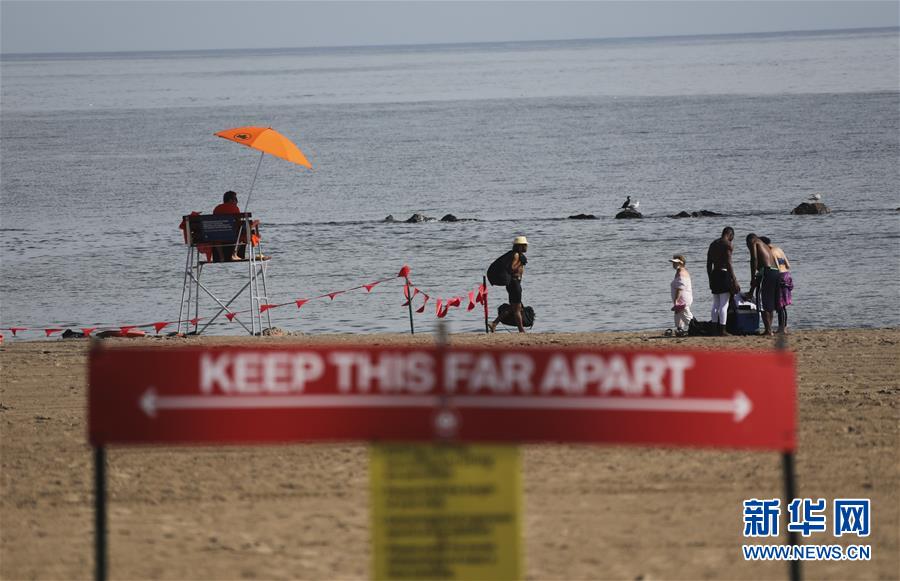 7月1日,救生員在美國紐約科尼島的一處海灘查看海面情況。當日,美國紐約市屬八處海灘正式重新準許民眾游泳,救生員也同時上崗。新華社記者王迎攝
