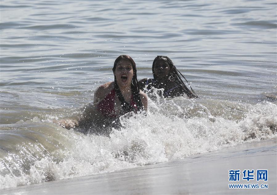 7月1日,人們在美國紐約科尼島戲水。當日,美國紐約市屬八處海灘正式重新準許民眾游泳,救生員也同時上崗。新華社記者王迎攝