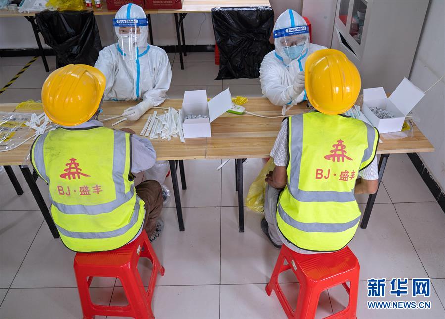 當(dāng)日,在北京市大興區(qū)中建三局二公司北京公司一項(xiàng)目建筑工地的臨時(shí)核酸檢測采樣點(diǎn),醫(yī)護(hù)人員為1353名建筑工地人員進(jìn)行核酸檢測采樣。新華社記者才揚(yáng)攝