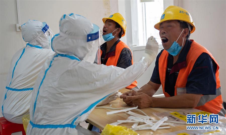 7月2日,在北京市大興區(qū)中建三局二公司北京公司一項(xiàng)目建筑工地的臨時(shí)核酸檢測采樣點(diǎn),醫(yī)護(hù)人員為建筑工地人員采集咽拭子。新華社記者才揚(yáng)攝