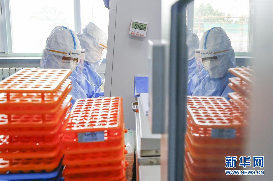 7月3日,中日友好醫(yī)院檢驗科新冠核酸檢測實驗室的檢驗人員閆克芹和張鑫(左)在實驗室內(nèi)處理剛剛送到的樣本。新華社記者張玉薇攝