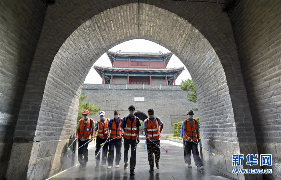 7月4日,防疫人員在宛平古城進(jìn)行環(huán)境消毒。當(dāng)日,北京市豐臺區(qū)組織防疫人員、安全監(jiān)察部門人員對社區(qū)、超市、公共場所進(jìn)行大規(guī)模環(huán)境消毒及疫情隱患排查,全力保障市民生活和工作環(huán)境安全。新華社記者 李欣 攝