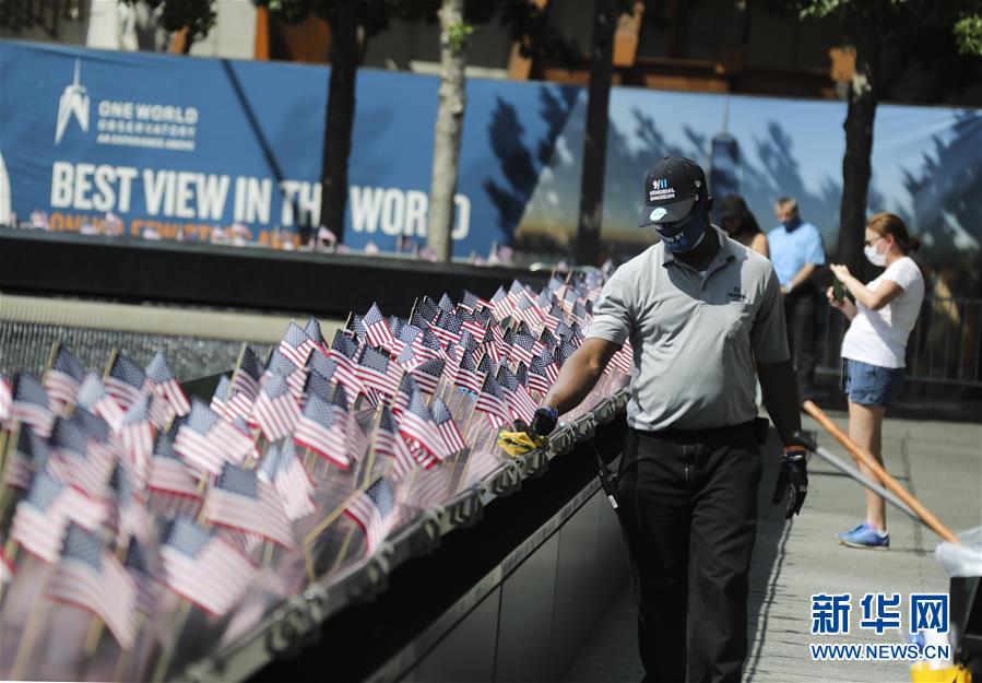 7月4日,工作人員在當(dāng)日重新開放的美國紐約“9·11”世貿(mào)中心遺址做清潔。當(dāng)日是美國獨立日,美國多地疫情仍面臨嚴(yán)峻形勢。美國約翰斯·霍普金斯大學(xué)實時統(tǒng)計數(shù)據(jù)顯示,美國累計新冠確診病例4日已超過280萬例。新華社記者王迎攝